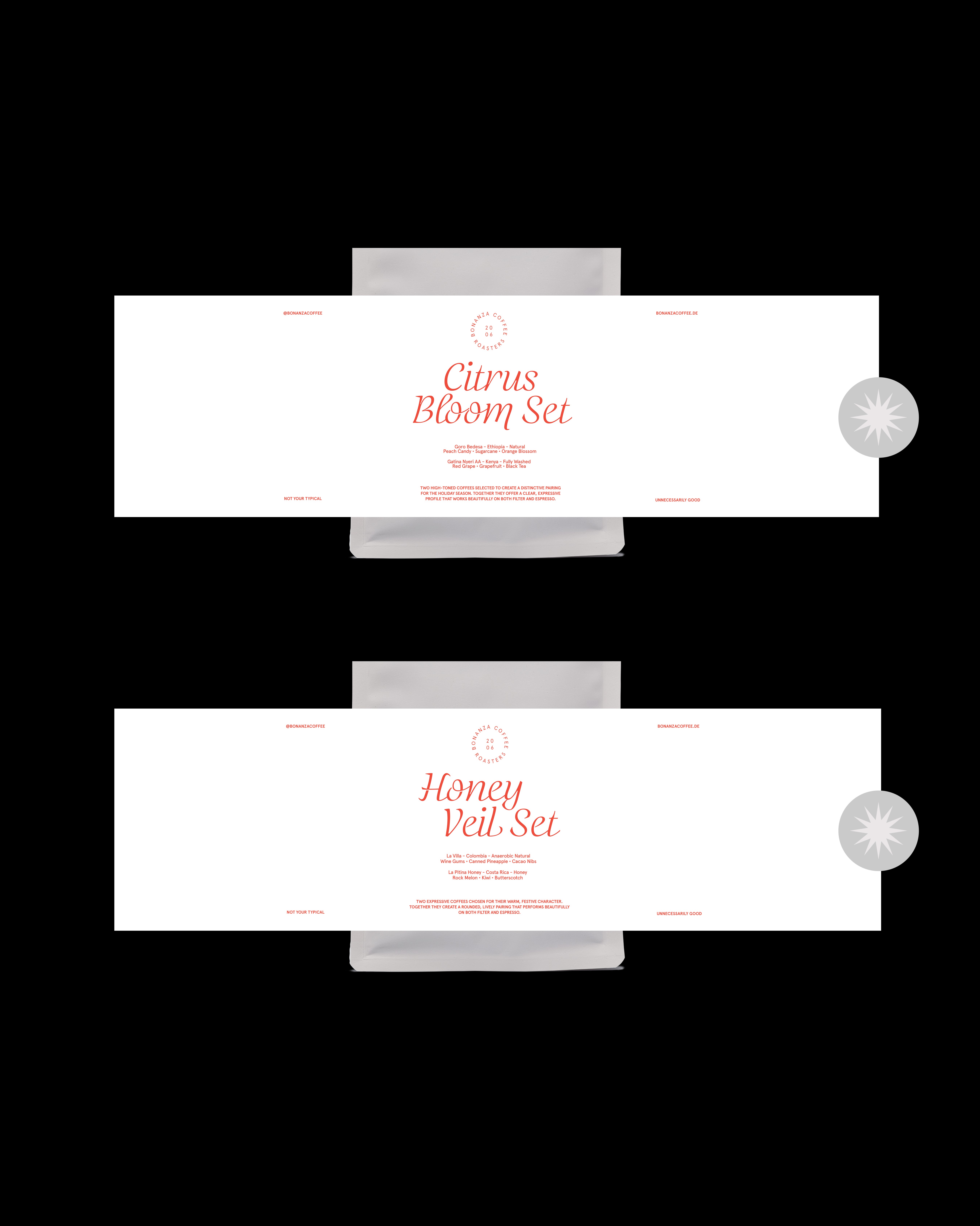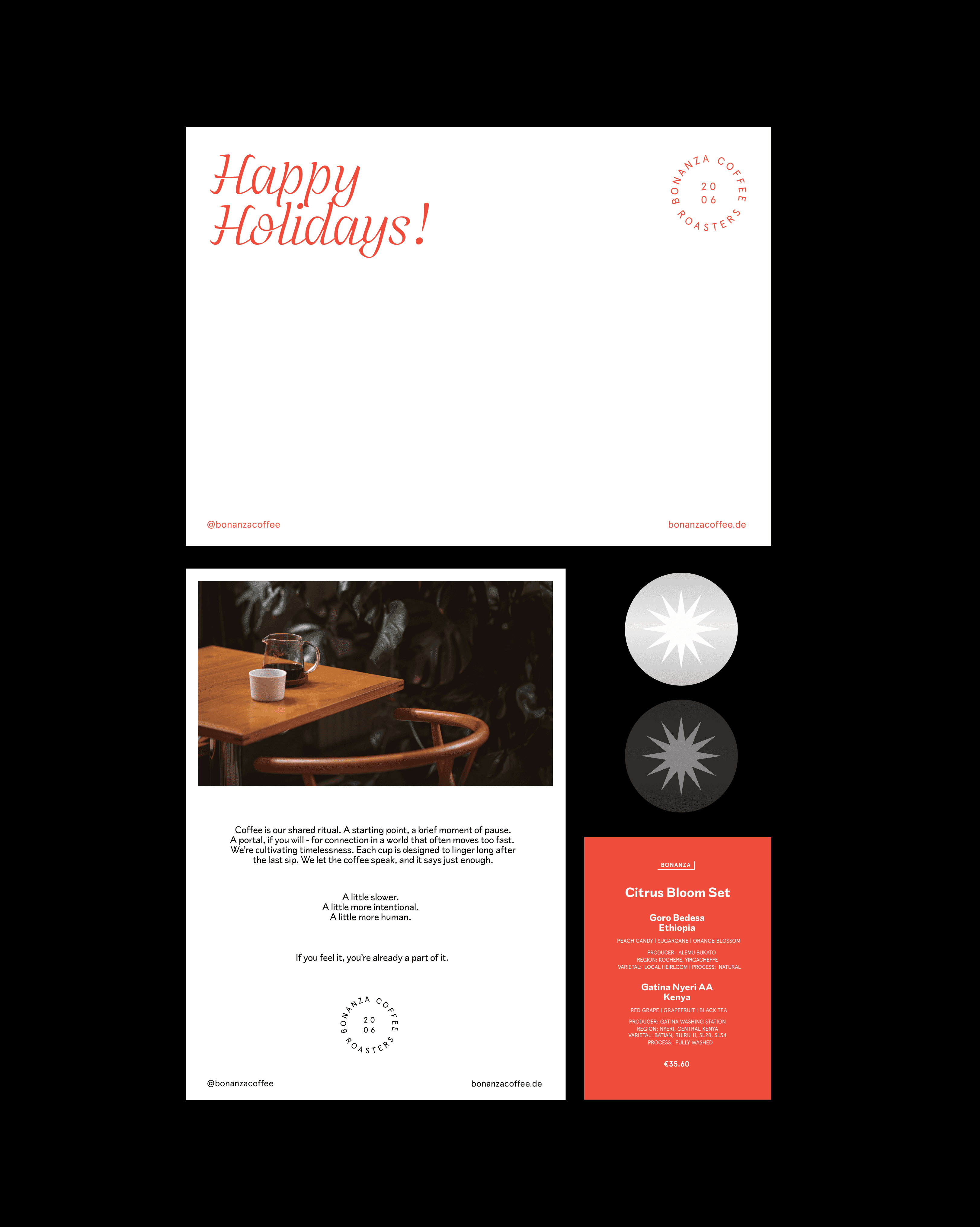 Packaging and visual systems developed to balance function, refinement, and sensory clarity. This includes the packaging solution for the Bonanza ACME Cup—created under tight timelines to be both protective and visually distinctive. For Bonanza’s Cascara Syrup, the label and visual language draw from its Costa Rican origin, translating natural warmth into a minimal, taste-driven expression. The label, visual language, and booklet for Bonanza’s Competition Coffee further the system, blending editorial precision with tactile detail to reflect the rarity and elevated craftsmanship of competition-level coffee. Most recently, the concept and design for Bonanza’s holiday coffee packaging extend this philosophy into a festive edition—pairing expressive flavor profiles with a refined, understated visual language crafted for the season.