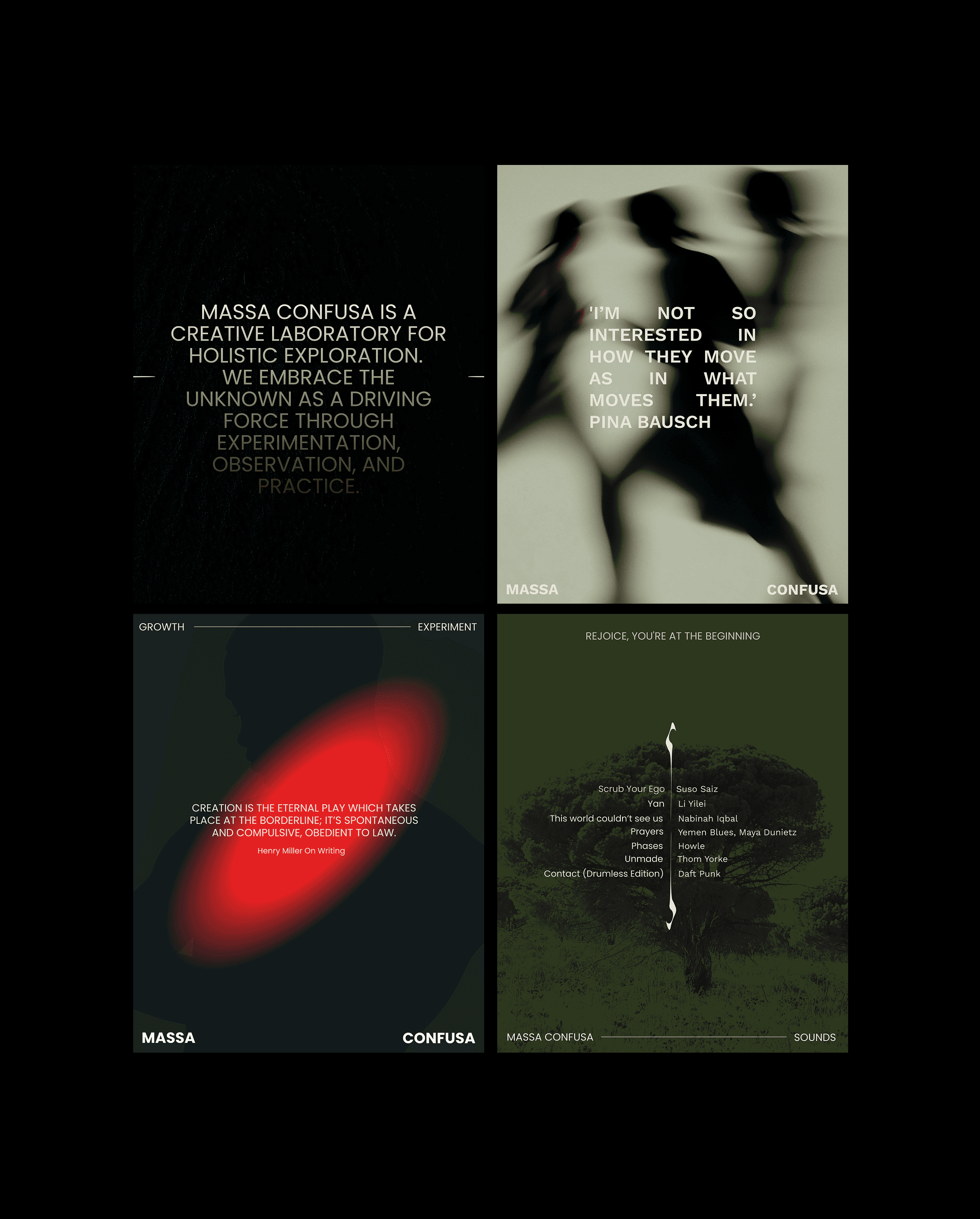 Designed a visual identity and content system for Massa Confusa, a Los Angeles–based creative laboratory exploring the subtle art of transformation. The identity frames creative chaos as a catalyst for exploration, evolving into an experimental visual language that balances tension and harmony across all digital expressions.
